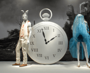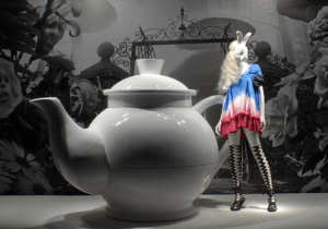 O los que crearon con motivo del estreno de Alicia en el País de las Maravillas, diseños sombríos y amplios pero bien trabajados para cada firma , escogiendo elemento a elemento para que formen un todo perfecto. Uno de los grandes aciertos de estos escaparates son las caretas de gato que llevan los maniquíes, que aportan el toque generalizado de la película.