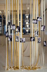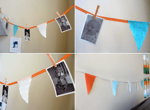 Las guirnaldas son siempre muy socorridas para decorar fiestas, porque se pueden hacer en un momento y sin gastarnos prácticamente nada. Podemos utilizar una cinta y colocar en ella triángulos de colores y fotos del homenajeado: